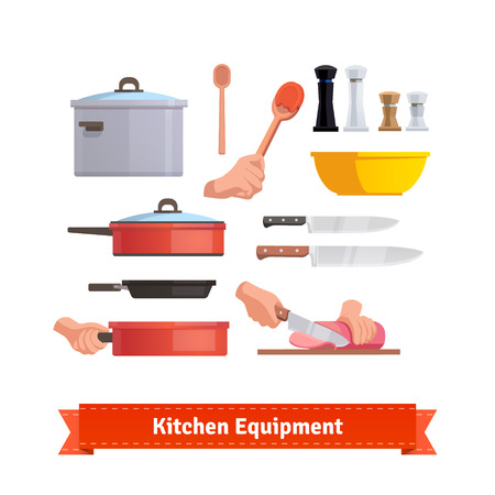 調理器具をセットします フライパン 塩コショウ入れ ポット シェフ ナイフし ボウルします フラット スタイルのイラストやアイコン Eps 10 ベクトル のイラスト素材 ベクタ Image